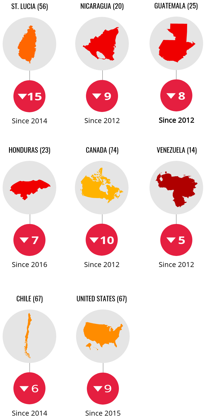 En este ranking sobre 180 países, Venezuela se ubica en la posición 177 con la percepción más alta de Latinoamérica con 14 puntos, seguida de Nicaragua y Haití con 20 puntos y Honduras con 23. En el lado opuesto están Uruguay con 73 puntos, Chile con 67, Costa Rica con 58 y Cuba con 46.