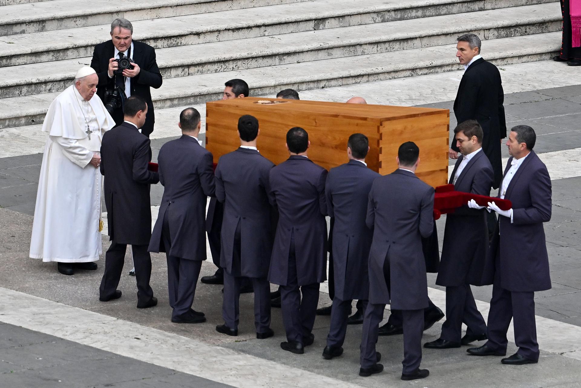 Desde el lunes Benedicto XVI yació en la basílica de San Pedro, vestido con un atuendo rojo y zapatos negros de clérigo. Se cree que más de 200 mil miembros del público desfilaron para presentar sus últimos respetos al papa número 265.