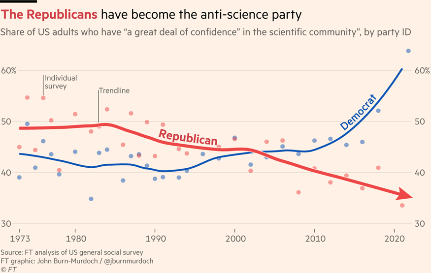 Desde entonces, el viaje ha sido tranquilo y rápido. En 1982, el 50 por ciento de los republicanos que se identificaban como tales declararon en la encuesta social general estadounidense que tenían "mucha confianza" en la comunidad científica. Veinte años después, el 50 por ciento había pasado a ser el 40 por ciento, y el año pasado sólo un tercio de los republicanos mantenía esa opinión, frente a dos tercios de los demócratas.
