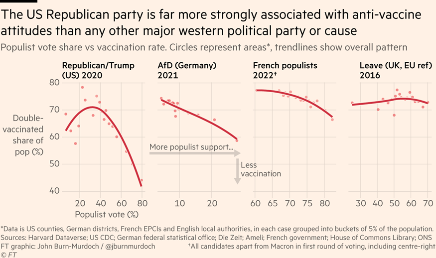 La política francesa y alemana no escapó a la politización. Según los últimos datos, el 40 por ciento de los habitantes de las zonas que más apoyan al partido de ultraderecha Alternativa para Alemania aún no se han vacunado, frente a un tercio de los habitantes de las zonas que más votaron a los partidos populistas franceses, pero estos porcentajes palidecen en comparación con el corazón del Partido Republicano, donde más del 55 por ciento siguen sin vacunarse.
