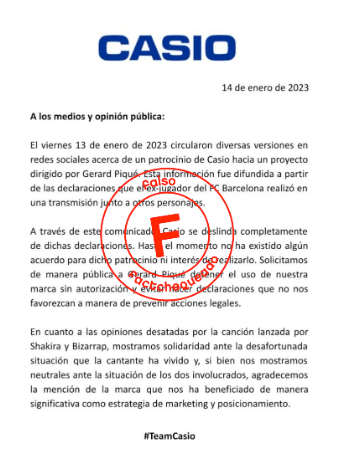 En el texto añadían que “Casio se deslinda” de cualquier acuerdo de patrocinio con Piqué.