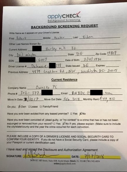 Comentaristas conservadores (como aquí y aquí) han afirmado que un documento proveniente de una supuesta revisión de antecedentes (background check) de Hunter Biden, el hijo del presidente Joe Biden (Partido Demócrata), demostraría que le pagaba a su padre $50,000 al mes para alquilar la residencia de Joe Biden en Wilmington, Delaware. Esto es falso.