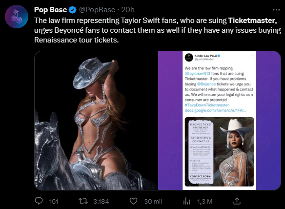 También se ha informado de que la firma de abogados que representa al grupo de 26 personas que denunciaron legalmente a Ticketmaster en California por su gestión en la venta de tickets para la gira de Taylor Swift se ha puesto a disposición de quienes sufran perjuicios en la próxima compra de entradas para la gira de Beyoncé.