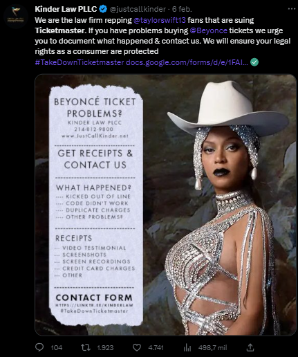 Anuncio de la firma legal Kinder Law PLLC poniéndose a disposición de quienes tuviesen problemas durante la compra de entradas para la gira de Beyoncé.