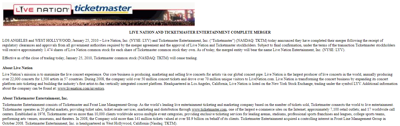 El 25 de enero de 2010, la empresa promotora de eventos Live Nation, Inc., y la compañía de venta de tickets y entradas, Ticketmaster Entertainment, Inc., emitieron un comunicado conjunto en el que anunciaron haber completado su fusión para pasar a ser la empresa Live Nation Entertainment.
