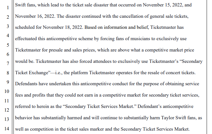 En ella señalan que “Ticketmaster ha llevado a cabo prácticas anticompetitivas al forzar a los seguidores de los músicos a utilizar exclusivamente el servicio de Ticketmaster para la preventa y venta de tickets con unos precios que están por encima de lo que sería un mercado competitivo.