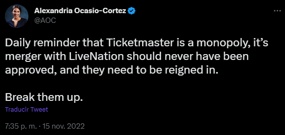 En ese momento, 15 de noviembre de 2022, Ocasio-Cortez señaló que Ticketmaster es un monopolio.