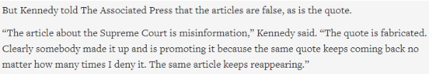 Asimismo, el propio Robert F. Kennedy Jr. ya dijo en 2021 a la agencia Associated Press (AP) que otras publicaciones que contenían atribuciones similares en referencia a un caso de la Corte Suprema eran erróneas. “Las citas son inventadas. Está claro que alguien se las ha inventado y las está promoviendo, porque la misma cita sigue apareciendo sin importar cuántas veces la niegue. El mismo artículo sigue reapareciendo”, explicaba.