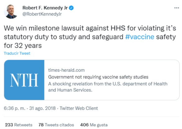 Por otro lado, estos contenidos aseguran que la victoria de Robert Kennedy fue “contra todos los cabilderos farmacéuticos”. Sin embargo, en el único caso relacionado con vacunas en el que los tribunales dieron la razón al abogado, la demanda no se interpuso contra ninguna farmacéutica, sino contra el Departamento de Salud y Servicios Humanos estadounidense (HHS, por sus siglas en inglés), como el mismo Kennedy Jr. comunicó en sus redes sociales.