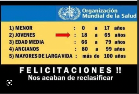 En la imagen usan el mismo logo de la OMS y presentan una lista con diferentes grupos etáreos, para decir que este organismo considera “menores” a las personas de 0 a 17 años, “jóvenes” a quienes tienen entre 18 y 65 años, de “edad media” a los de entre 66 y 79, “ancianos” a aquellos de 80 a 99 y “mayores de larga vida” a quienes superan los 100 años. “Felicitaciones!! Nos acaban de reclasificar”, indica la imagen a continuación.