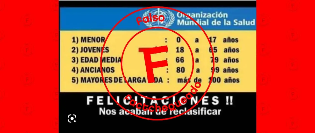 - Al menos desde 2018, circula en WhatsApp y redes sociales un contenido que afirma que la Organización Mundial de la Salud (OMS) ha “reclasificado” a la población en base a sus edades y ahora considera como ‘jóvenes’ a las personas de entre 18 y 65 años.
