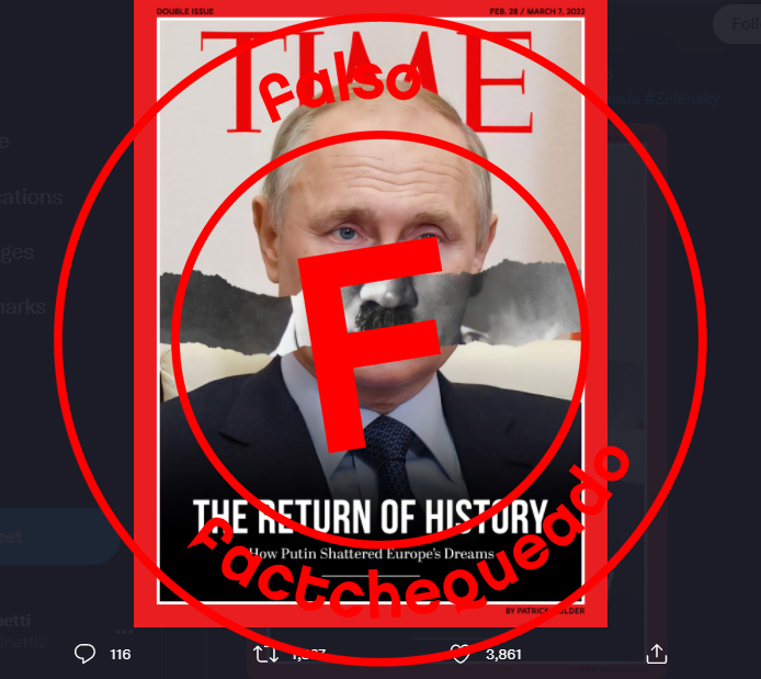 Durante este año también vimos lasimbología nazi adjudicada a Putin. Por ejemplo, esta supuesta portada de la revista TIME con una foto del actual presidente ruso con el bigote del exdictador alemán Adolf Hitler, que se comprobó que está manipulada.
