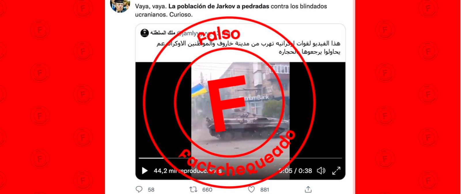 Por ejemplo, circuló en redes sociales un video en el que supuestamente personas en la ciudad Kharkiv/Járkov, Ucrania, lanzan piedras contra un tanque ucraniano. El video no corresponde con la invasión rusa de febrero de 2022. En realidad fue grabado en la ciudad ucraniana de Mariupol el 9 de mayo de 2014 durante enfrentamientos entre el ejército ucraniano y grupos prorrusos.
