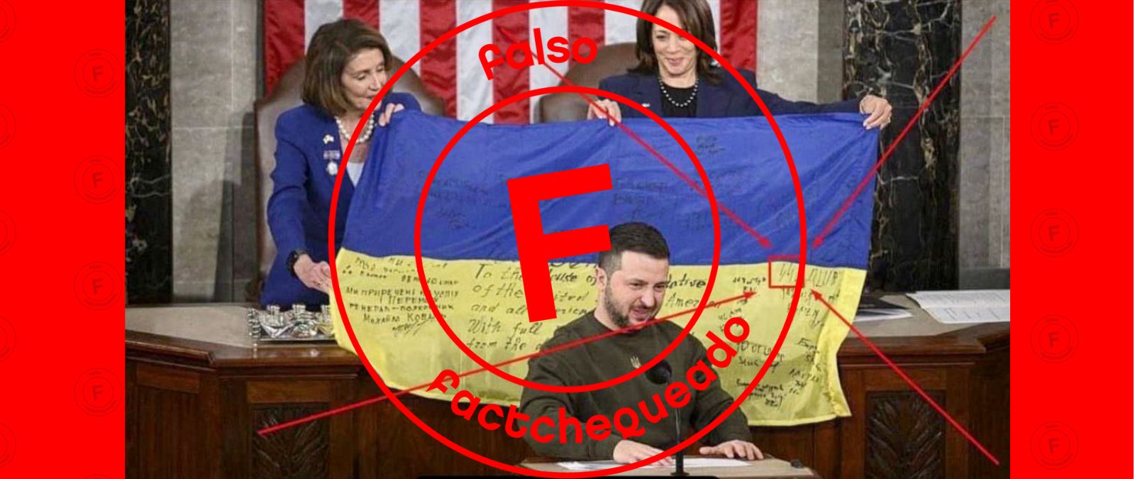 También circuló en redes sociales una imagen de la visita del presidente Zelenski al Congreso de los Estados Unidos, según la cual supuestamente habría entregado una bandera ucraniana con simbología nazi. Pero ello también es falso: la imagen está manipulada. En la fotografía original no se observa este símbolo.