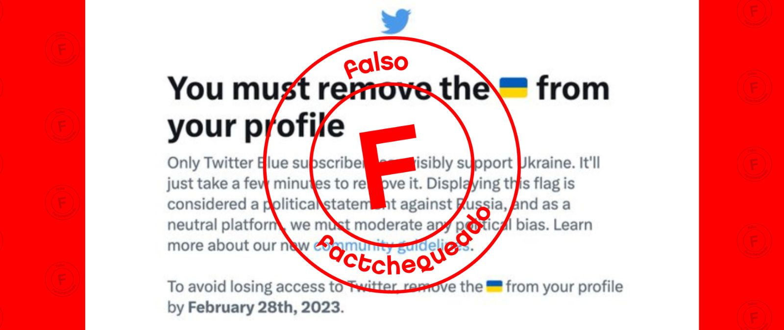 - Comenzó a circular en redes sociales que Twitter les está pidiendo a los usuarios que no están suscritos al servicio premium Twitter Blue que eliminen la bandera de Ucrania de sus tuits y perfiles. Esto es falso.