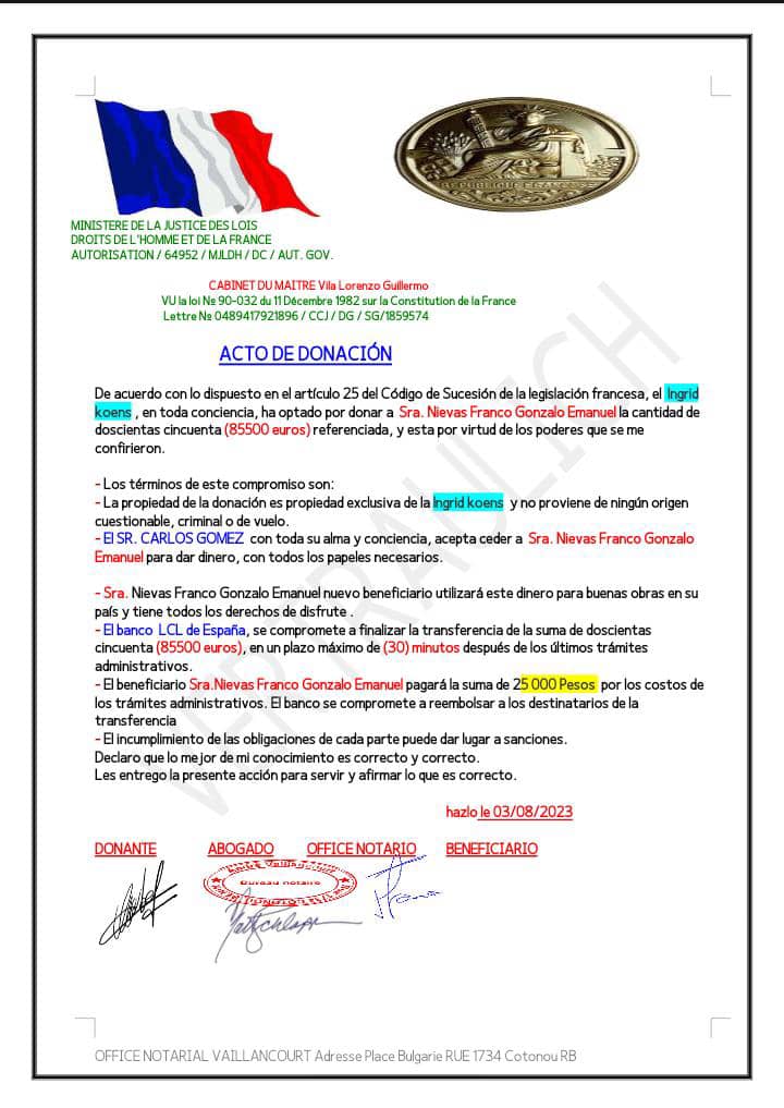 - Para hacer creíble la trampa, el estafador aporta un supuesto documento oficial llamado “acta de donación” que incluye la bandera de Francia, pero tiene errores ortográficos y de edición, además de inconsistencias en el contenido. Autoridades francesas alertaron en 2022 sobre este tipo de estafa en la que utilizan su bandera.