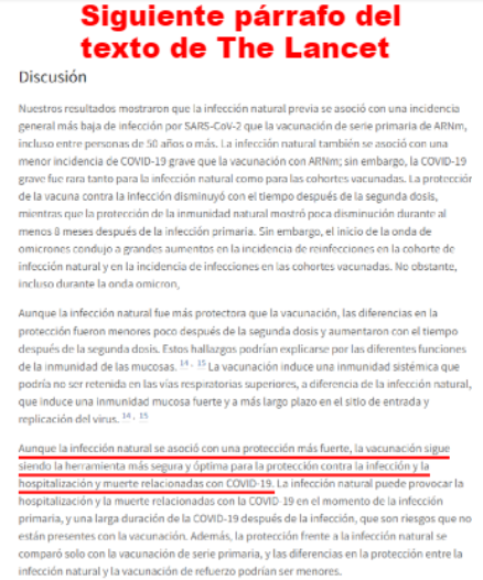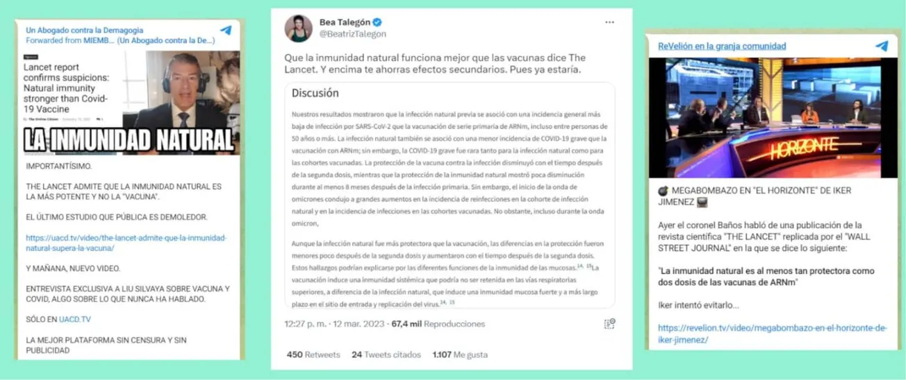 “Que la inmunidad natural funciona mejor que las vacunas [contra el COVID-19] dice The Lancet. Y encima te ahorras efectos secundarios. Pues ya estaría”. La escritora en el portal Diario16 Beatriz Talegón ha difundido en un tuit un extracto de un trabajo científico publicado en la revista científica The Lancet. Canales de Telegram (ver 1 y 2) también han compartido este mismo estudio, diciendo que lo que prueba es que la inmunidad adquirida por contraer el COVID-19 es "mejor" a la hora de protegerse que la vacuna contra esta enfermedad.