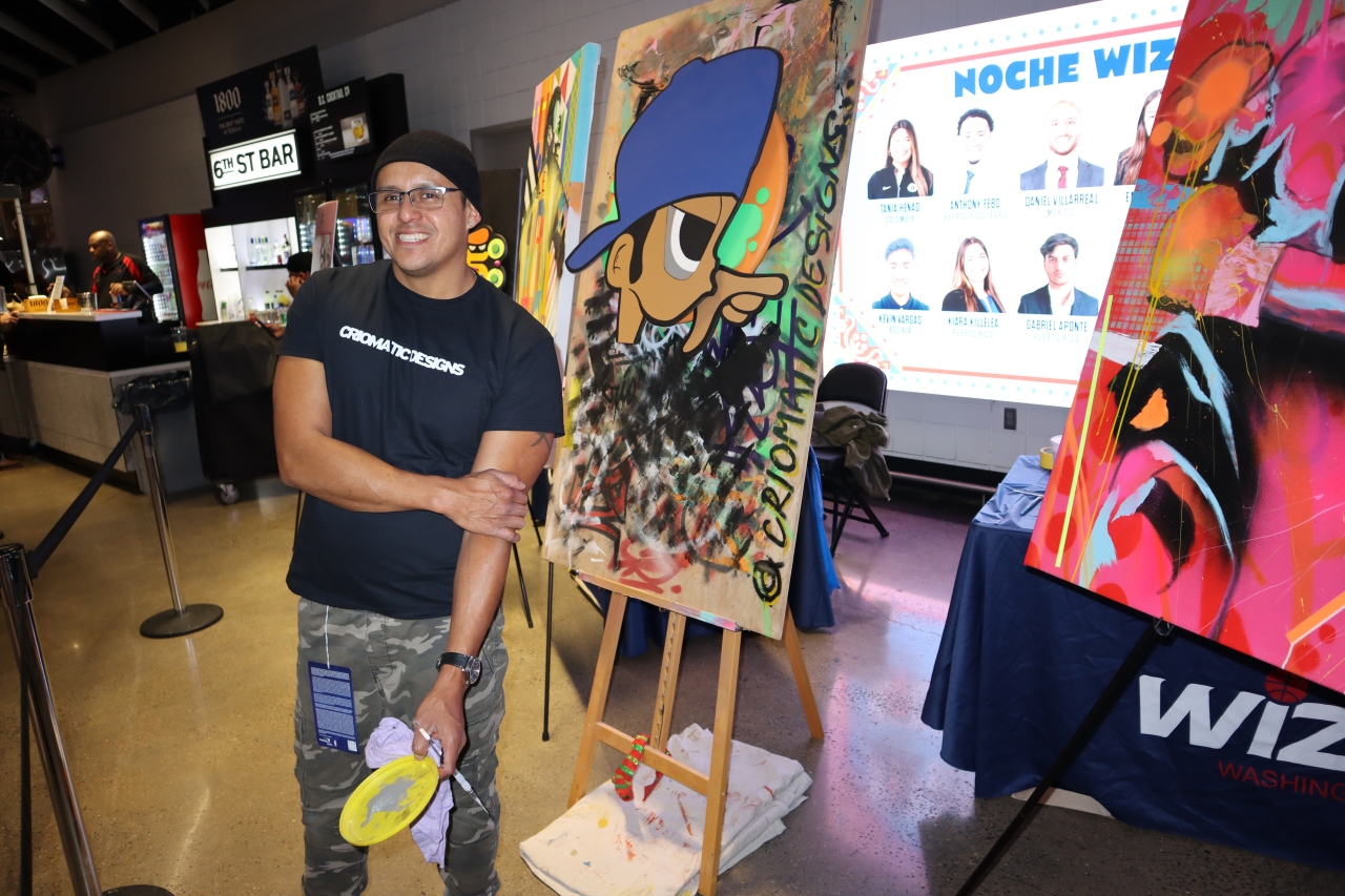 “Aquí vengo a representar a la comunidad latina en Noche Wizards. Estoy orgulloso de participar y unirme a quienes vienen a ver el juego de básquet. Yo vengo del grafiti, ese es mi ‘background’. Soy grafitero y ahora me dedico a hacer producciones comerciales privadas. Me gusta experimentar con diferentes medios y pues aquí traje un poquito de lo que hago en el estudio”, relató Pineda.