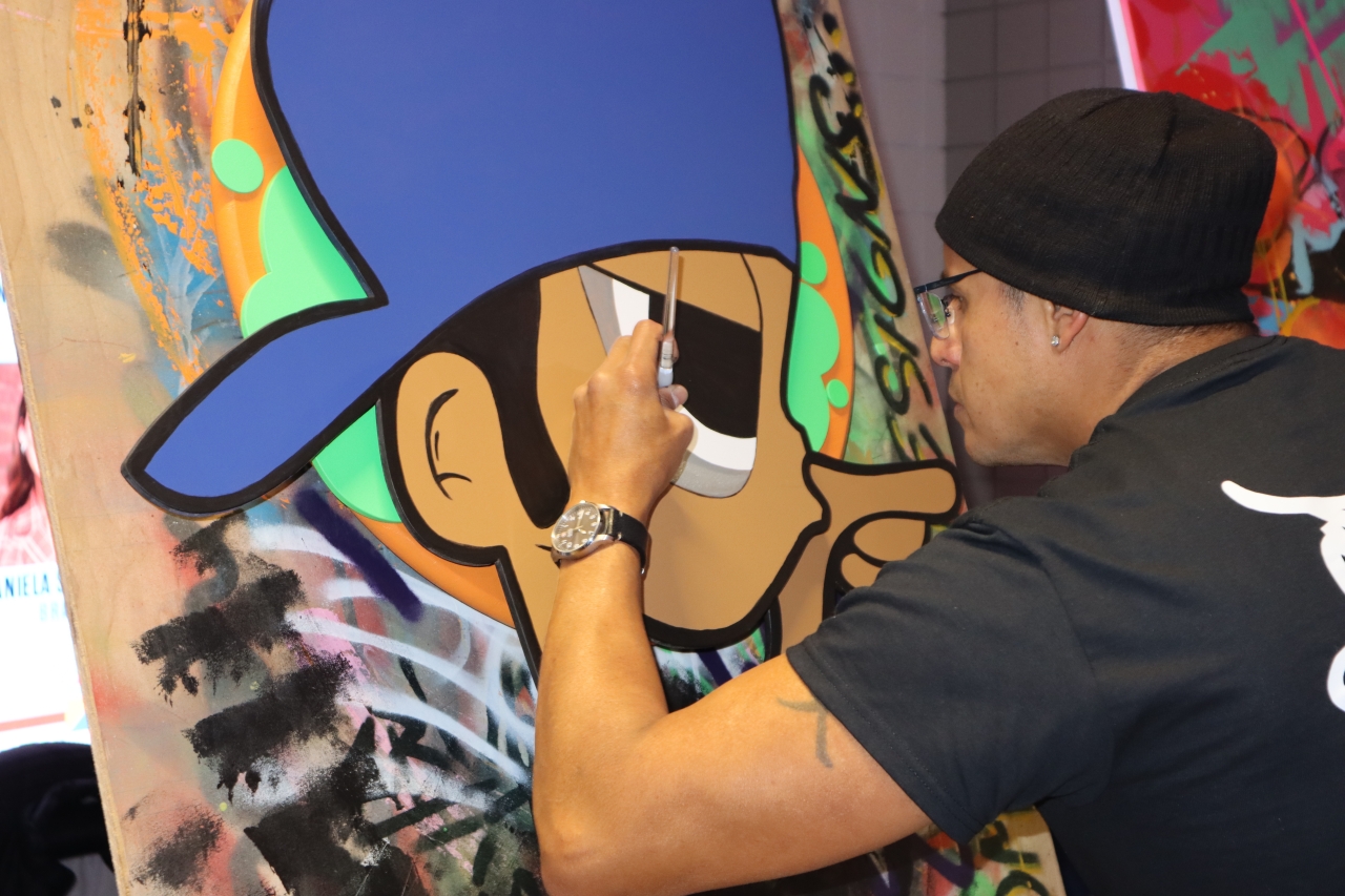 Una obra de arte resaltaba en el centro, un chico con gorra azul que sobresalía en relieve de un fondo de colores, mientras que en otra técnica a la par se veía a Pelé con su camiseta número 10 de espaldas y figuras geométricas rodeándolo, que al mismo tiempo se entrelazaban con su cuerpo. Del lado opuesto, un boxeador. En el centro él pintaba la obra en proceso. En su descripción se leía que estaba residenciado en DC y que su estilo estaba caracterizado por ser urbano-contemporáneo / arte de calle. “Su conexión con las tradiciones resultaron en un trabajo de mural único en el área de Maryland y Washington DC desde mediados de los 90”, se leía.