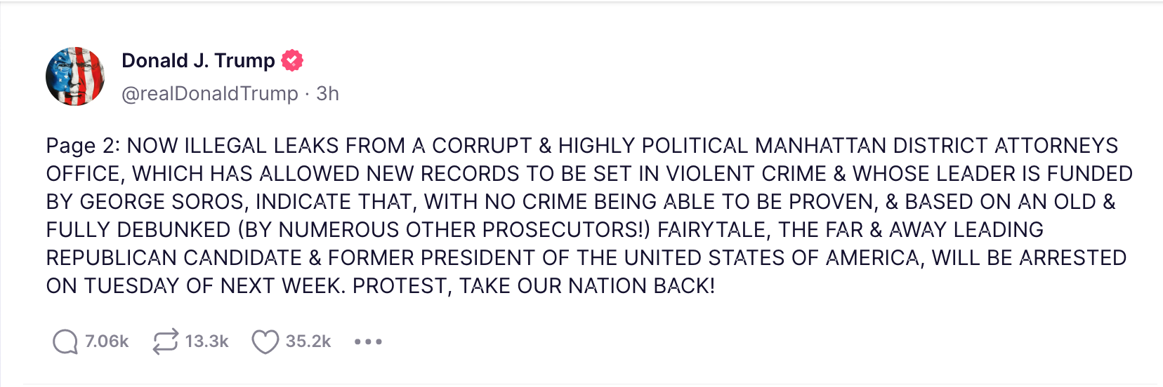 "El principal candidato republicano y ex presidente de Estados Unidos será arrestado el martes de la próxima semana", escribió Trump, citando "filtraciones ilegales" de la oficina del fiscal de distrito de Manhattan.