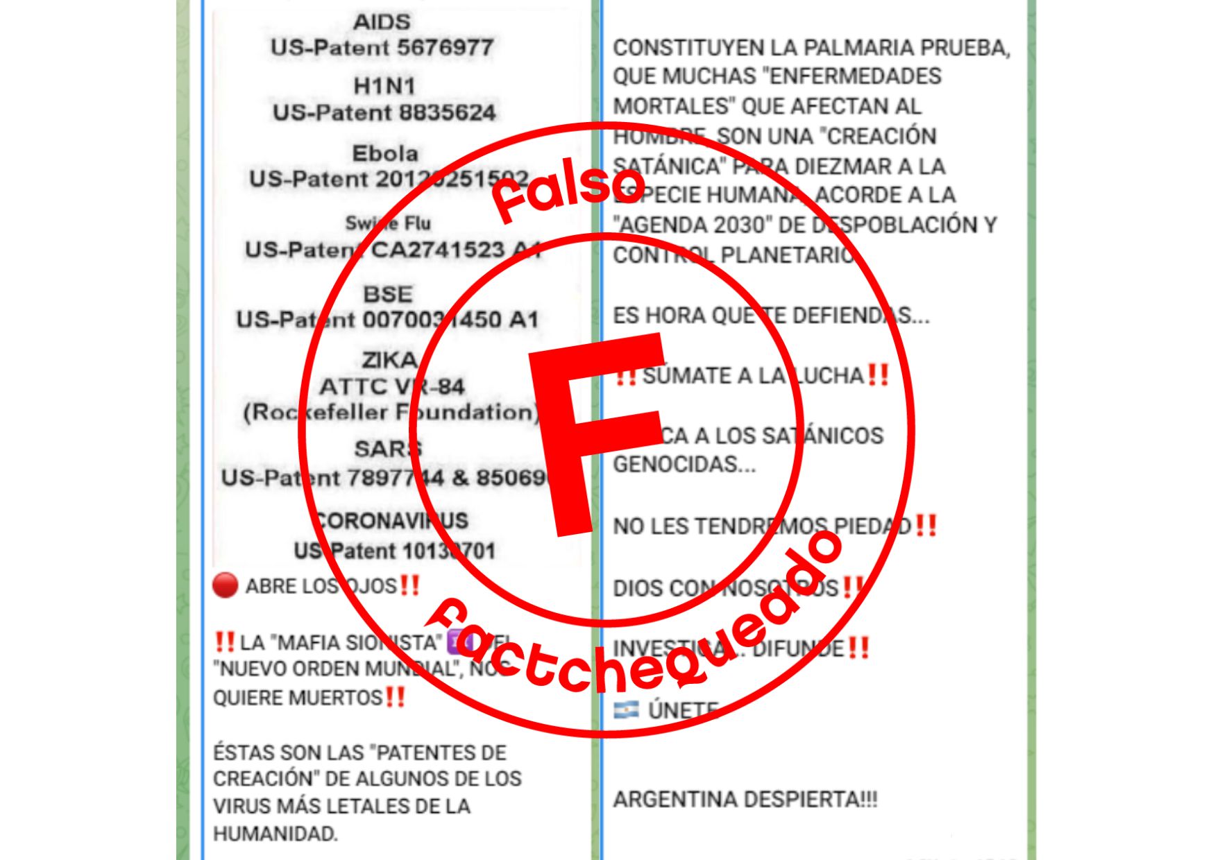 Otro tipo de desinformación que circula de forma recurrente en diferentes canales de Telegram está relacionada con la salud, y proliferó principalmente durante la pandemia del COVID-19. Entre ellas, una de las más virales está relacionada con la creación de diferentes tipos de virus -como el del coronavirus, el SIDA o la gripe H1N1- con el supuesto objetivo de promover “la despoblación y el control planetario” (que las narrativas desinformantes vinculan con la Agenda 2030).