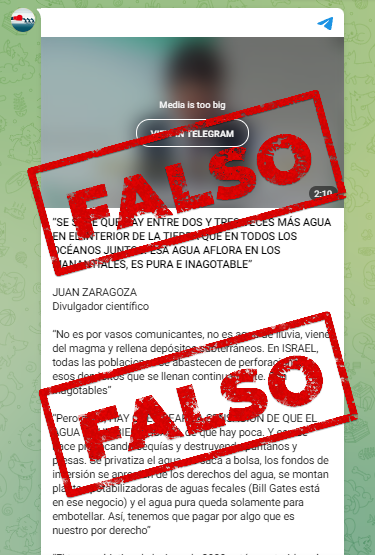 Las narrativas desinformantes también hacen foco en el control de los recursos, como el agua. En este caso, posteos de Telegram aseguran que es “mentira” que este elemento natural sea escaso, dado que “en el interior de la Tierra hay entre 2 y 3 veces más agua que en todos los océanos juntos” (ver acá y acá).