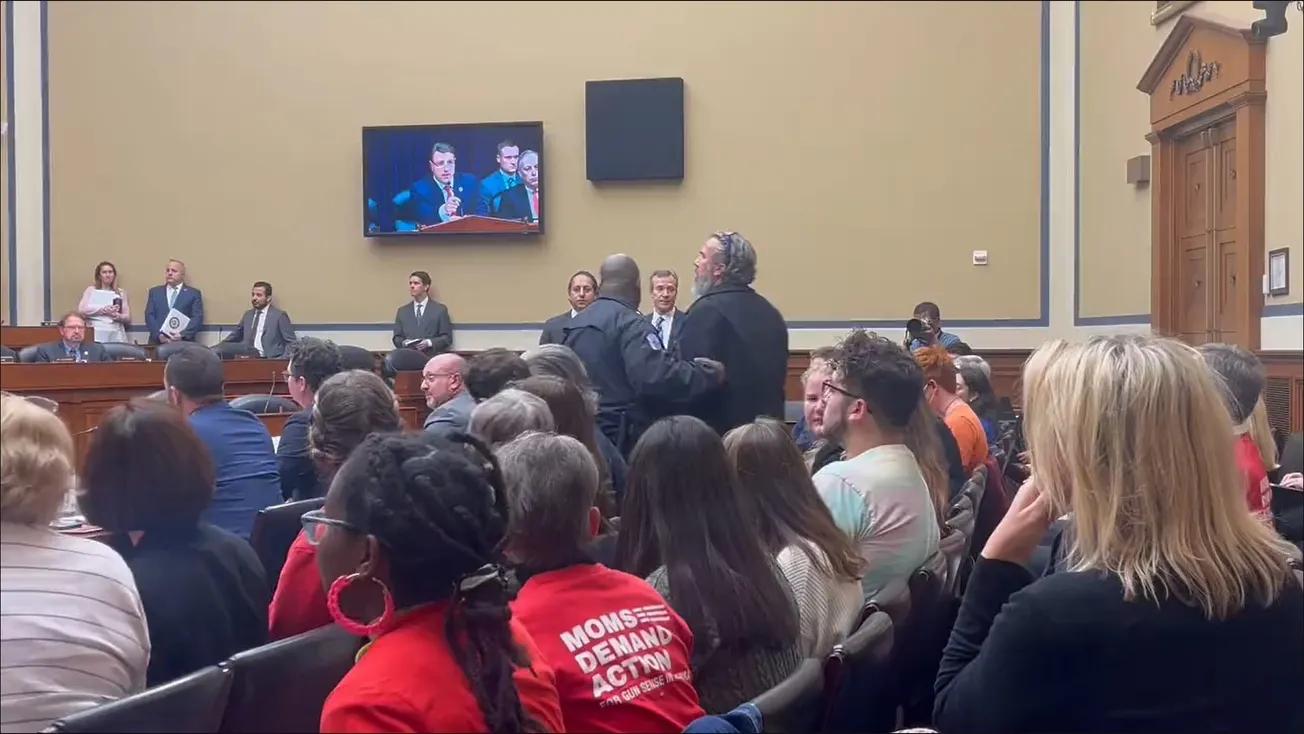 - Antes de que los activistas dejaran el lugar, Fallon comparó la interrupción de la audiencia con el asalto al Capitolio refiriéndose a la pareja. "¿Es esto una insurrección? No quiero otro 6 de enero, ¿verdad?", dijo, luego de recordarles que podían ser retirados por "comportamiento indisciplinado", mientras que preguntó: "¿La policía del Capitolio no está haciendo su trabajo?, al seguir escuchando la voz de Patricia.