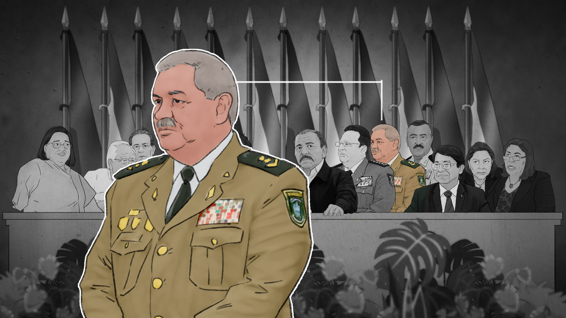 Al otro lado de la mesa, a la izquierda y junto a Avilés, se sientan el jefe del Estado Mayor del Ejército, general Bayardo Rodríguez; y el inspector general, Marvin Corrales. Ellos forman el trío del poder militar en Nicaragua.