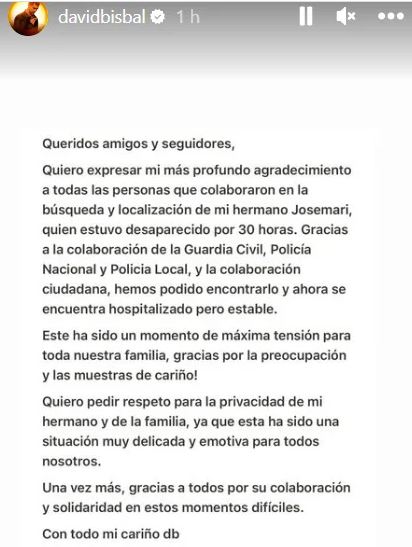A través de un comunicado David Bisbal compartió con sus "amigos y seguidores" su profundo agradecimiento a "todas las personas que colaboraron en la búsqueda y localización" de a quien él se refiere cariñosamente como "Josemari".