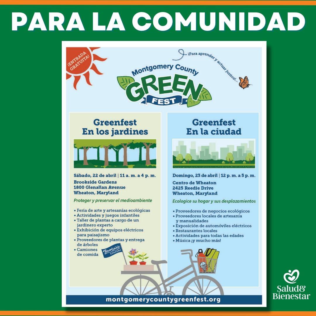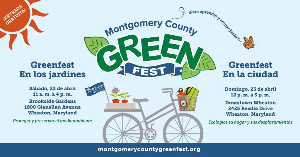 La octava edición anual del GreenFest del condado de Montgomery vuelve este año y se celebrará en dos lugares diferentes: el "GreenFest en los jardines" tendrá lugar en Brookside Gardens, en Wheaton, el sábado 22 de abril, y el "GreenFest en la ciudad" se celebrará en Marian Fryer Town Plaza, en el centro de Wheaton, el domingo 23 de abril. Ambos serán eventos gratuitos y familiares organizados por una coalición de socios públicos, sin ánimo de lucro y universitarios.