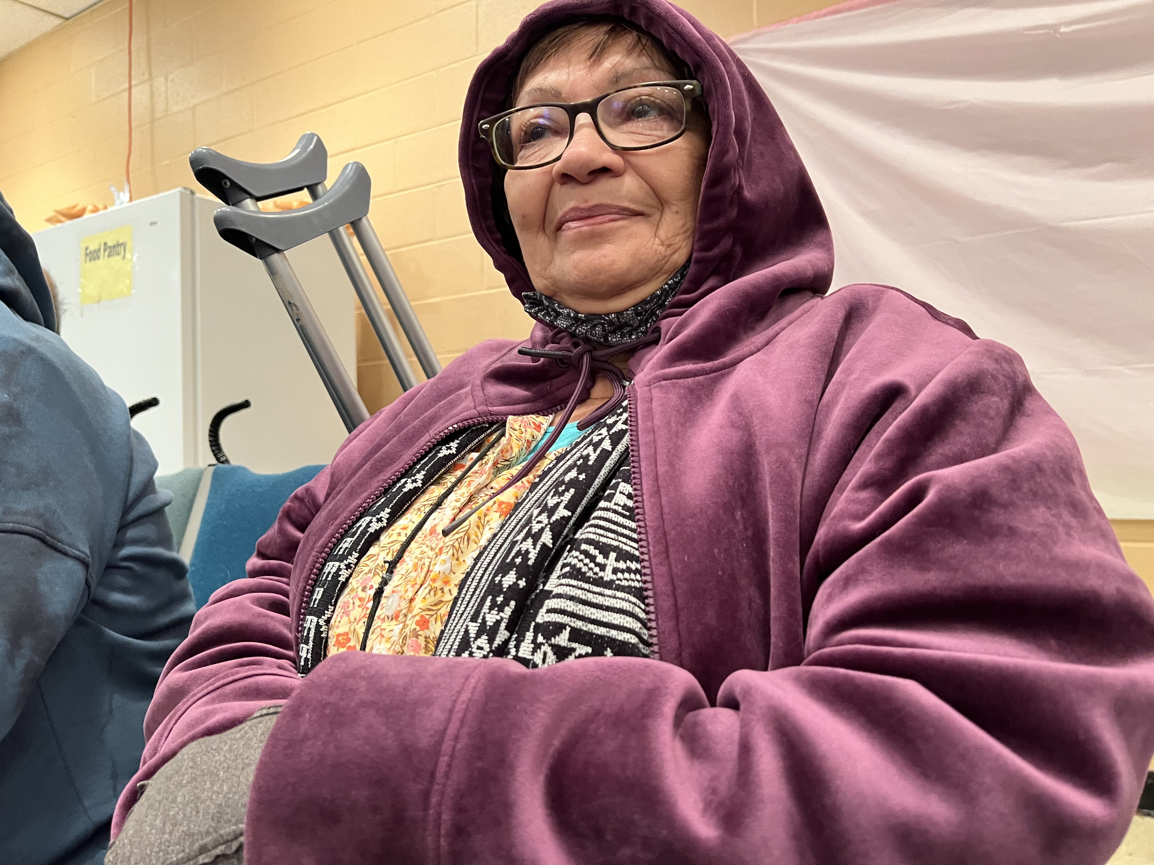 AGRADECIDA. Antonia Chamorro, de Argentina, está lesionada y agradece por los víveres que recoge en la Iglesia Columbia, de Falls Church, Virginia. | Foto: Milagros Meléndez para El Tiempo Latino