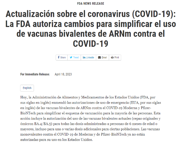 Los tuits que circulan indican que las vacunas de Pfizer y Moderna han sido prohibidas, a raíz de una nueva comunicación de la FDA del 18 de abril de 2023. Pero esto también es falso. La FDA no ha prohibido las vacunas de Pfizer y Moderna, y de hecho sigue recomendando “mantenerse al día de la vacunación”, como recogen en su comunicado.