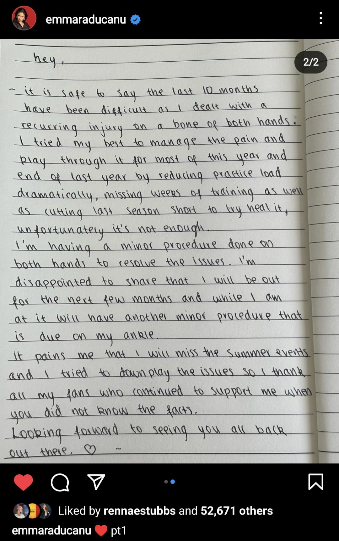 En su cuenta oficial, la tenista explicó que ha estado luchando contra una lesión recurrente en un hueso durante los últimos diez meses."Estoy decepcionada por tener que anunciar que estaré de baja durante los próximos meses (...) Lamento perderme los torneos de verano (boreal)".