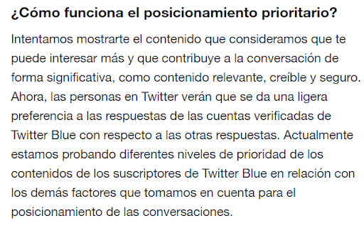 Además, Twitter explica que se están probando “diferentes niveles de prioridad de los contenidos de los suscriptores de Twitter Blue en relación con los demás factores que tomamos en cuenta para el posicionamiento de las conversaciones”. El 25 de abril de 2023 Elon Musk, el CEO de la compañía, tuiteó que “ahora las cuentas verificadas son priorizadas”.