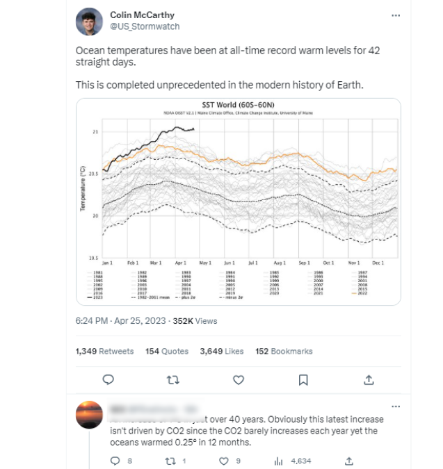 Otro caso ha sido con una publicación de Colin McCarthy, experto en ciencias atmosféricas y creador de la aplicación “My radar”, quien tuiteó un gráfico para mostrar que “las temperaturas del océano han estado en niveles cálidos récord de todos los tiempos durante 42 días consecutivos”, algo que, de acuerdo con em experto, “no tiene precedentes en la historia moderna de la Tierra”.
