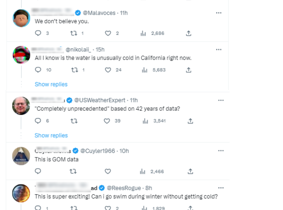 Pero frente a este tuit también las primeras respuestas son de usuarios de Twitter Blue y negacionistas. “Todo lo que sé es que el agua está inusualmente fría en California en este momento”, dice el primero de los comentarios, que niega el argumento de McCarthy. Esto es súper! Puedo ir a nadar en invierno sin tener frío?”, respondió otro en tono de broma.