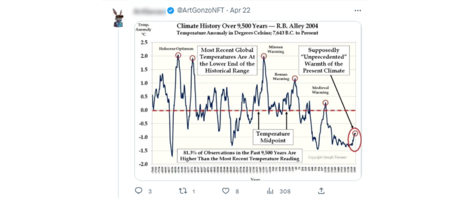 En la publicación, todas las primeras respuestas son de usuarios que cuentan con el check azul de Twitter Blue -como hemos indicado, hoy en día es la única forma-, y muchos de ellos han respondido con contenidos negacionistas del cambio climático. Por ejemplo, este usuario respondió con un gráfico que dice mostrar que el aumento de la temperatura global “no es algo actual”. Desde Maldita.es han alertado de ese contenido: la gráfica no desmiente el calentamiento global porque refleja sólo la temperatura en un punto de Groenlandia y, al acabar en 1885, no incluye la crisis climática actual iniciada por la Revolución Industrial, que empezó precisamente en esa época.