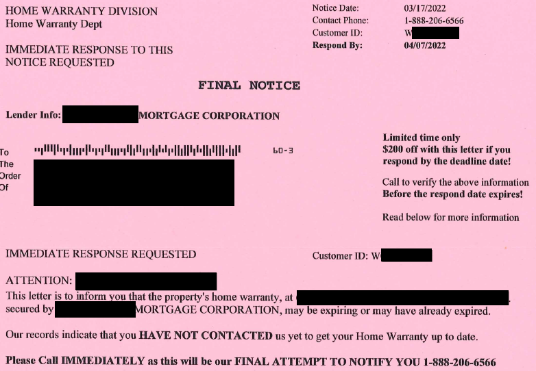 - Si te llega una carta de una compañía de garantías que desconoces diciendo que algo es urgente o tu última oportunidad (“final notice”), probablemente se trate de una estafa.