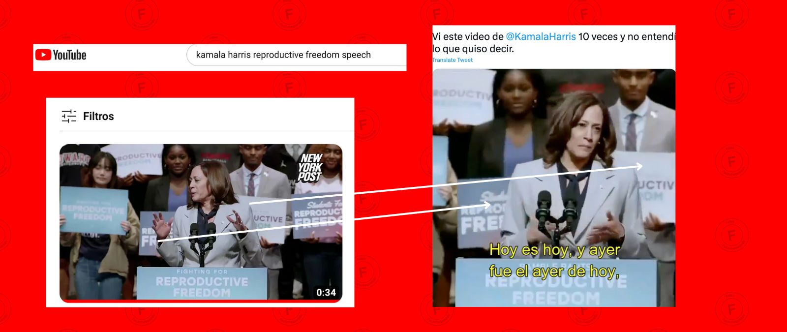 Primero buscamos en Youtube videos de discursos de Harris sobre libertad reproductiva, y encontramos el que coincide con el video manipulado. La ropa de Harris, las personas paradas detrás de ella y los avisos coinciden.