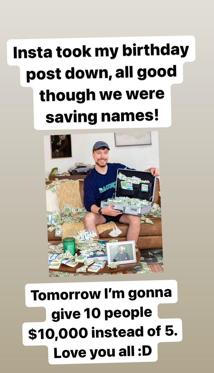 Según explicó el propio MrBeast en sus stories, Instagram eliminó su post por considerarlo spam o contenido engañoso. El youtuber se mostró indignado y aseguró que no había hecho nada malo. La publicación significó el incremento en 7 millones de seguidores, 12.4 millones de me gusta y 13.6 millones de comentarios, algo de lo que se ufanó en Twitter.