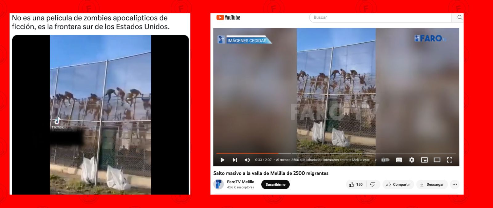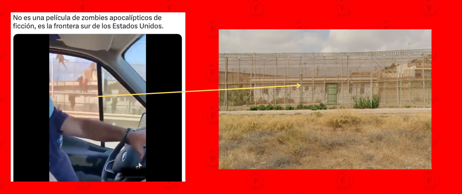 Ese segundo contenido aparece a partir del segundo 6, cuando comienza un video grabado desde adentro un vehículo en el que se ve al conductor manejando al lado de la valla metálica mientras, en el fondo, se puede ver a los migrantes intentando escalarla.
