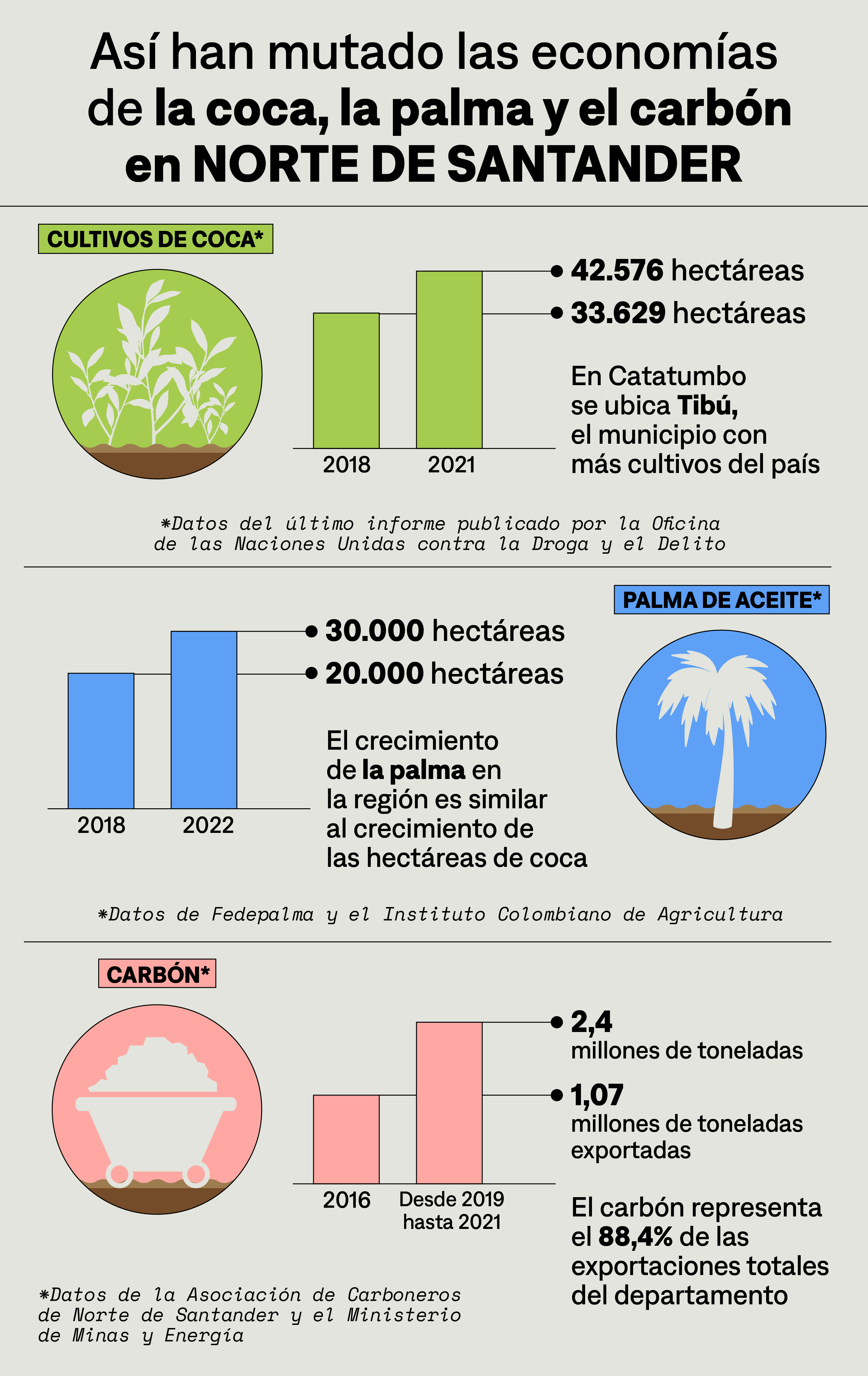 La cruda realidad es que en el Catatumbo el único cultivo legal que tiene salida comercial a gran escala es la palma aceitera. Las plantas de procesamiento industrial establecidas cerca de Cúcuta por empresas como Palnorte y Óleo Norte le están permitiendo a los campesinos vender los cogollos de palma con mucha más facilidad que cualquier otro producto. Según Fedepalma, a finales del 2018 el Catatumbo se consolidó como una de las zonas palmeras más importantes del país con 20 mil hectáreas. En 2022 esta cifra subió a 30 mil hectáreas, según el Instituto Colombiano de Agricultura.