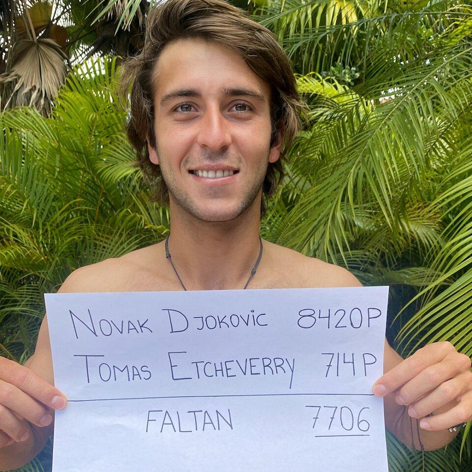 Djokovic, siempre atento a todo, se enteró de la idolatría que siente Etcheverry por él, y también de esos carteles virales en el que el argentino mostraba la diferencia de puntos entre el serbio y él. Y en una nota previa a su participación, en declaraciones a Tennis TV, Djokovic tomó la situación con una sonrisa: “Lo sé, lo he visto, ja”. Y luego, mientras veía las imágenes, comentó: “En aquel entonces tenía muchos más puntos, ahora tengo menos, así que él tiene una chance de achicar la diferencia mañana”.