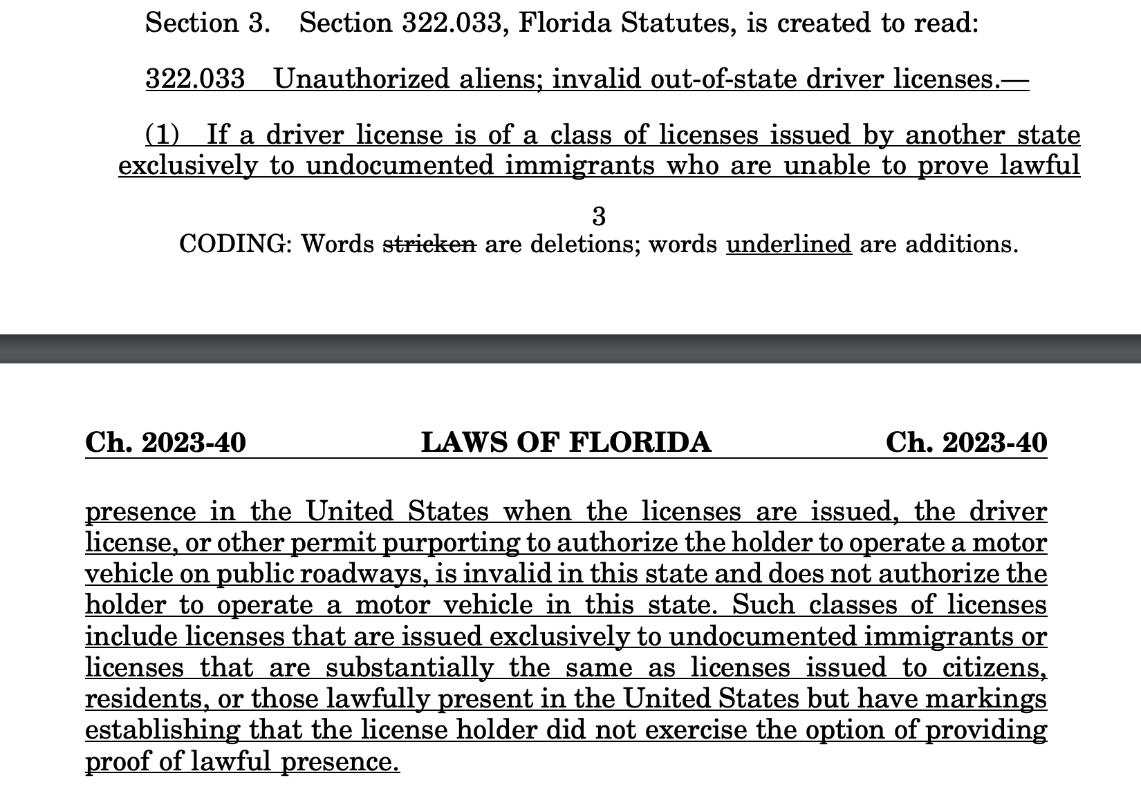 - La ley invalida algunas licencias de conducir de otros estados, califica como un delito grave cruzar la frontera de Florida con alguien indocumentado, extiende la obligación del uso de E-Verify para empresa privadas con más de 25 empleados, y requiere que algunos hospitales preguntan el estatus migratorio de los pacientes.