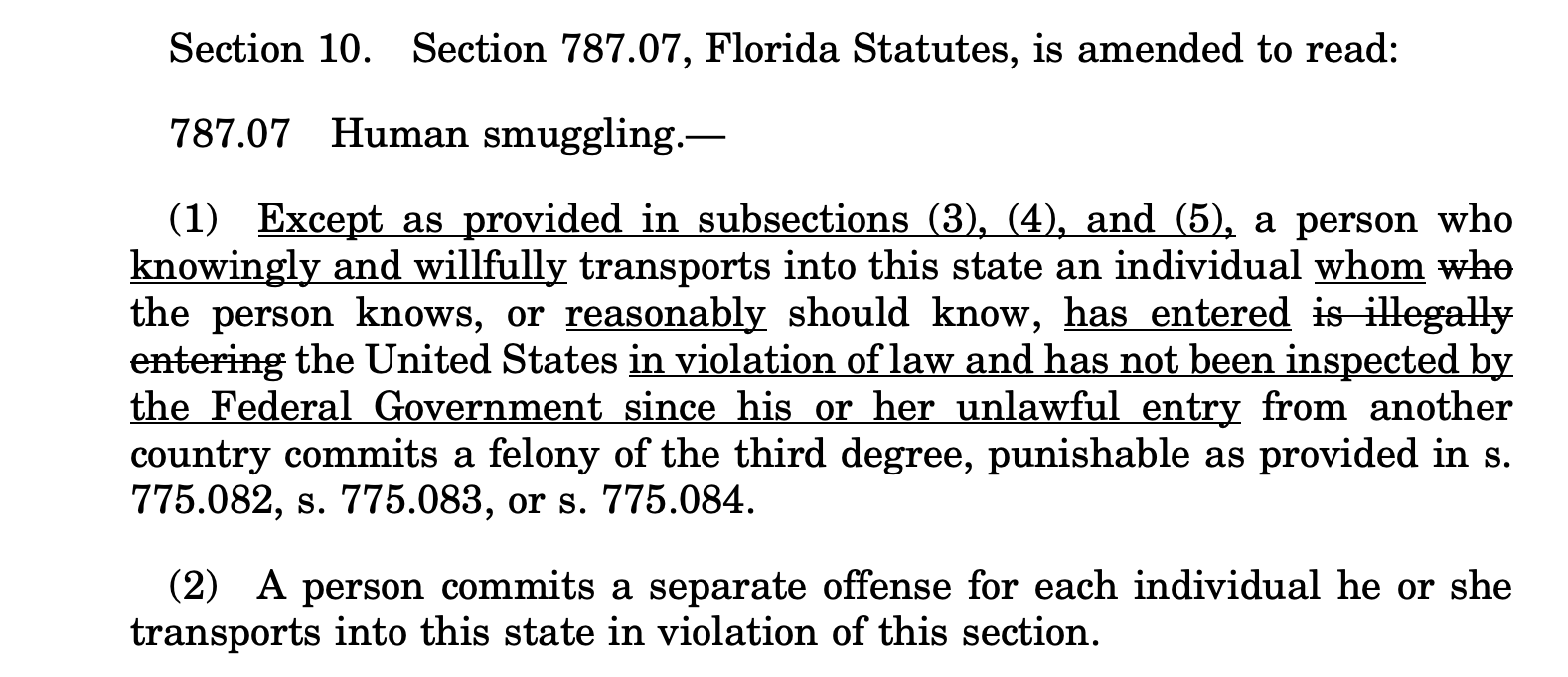 La ley establece que la persona comete un delito por cada individuo que esté transportando a través de la frontera con Florida y la gravedad del delito aumenta si transporta a más de 5 personas o a un menor de edad.