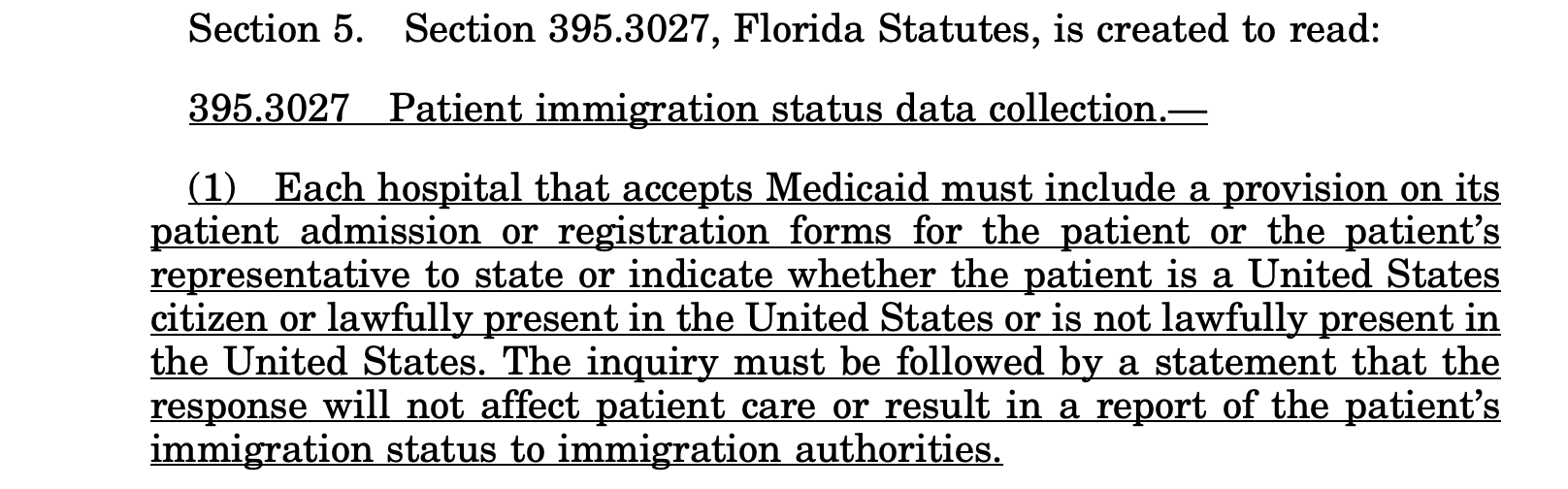 De acuerdo con el numeral 3 de esta sección de la ley (página 5), el gobierno de Florida quiere recabar estos datos para que se emita un reporte que incluya “el costo de tratamientos no remunerados dados a extranjeros que no están legalmente presentes en los Estados Unidos”.