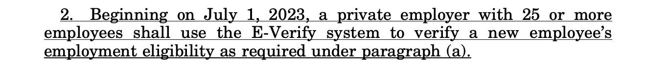 “A partir del 1 de julio de 2023, cualquier empleador privado con 25 o más empleados debe usar el sistema E-Verify para verificar que el empleado sea elegible para trabajar”.
