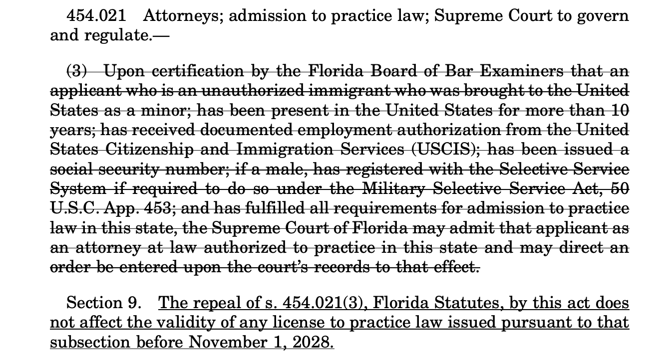 Sin embargo, la sección 9 (que puedes leer justo arriba) indica que la ley no afectará la validez de las licencias para ejercer como abogado que sean emitidas antes del 1 de noviembre de 2028. Es decir, quienes obtengan su licencia para ejercer como abogados en Florida antes de esa fecha podrán seguir ejerciendo su profesión en Florida, confirmó el abogado Rosada a Factchequeado.
