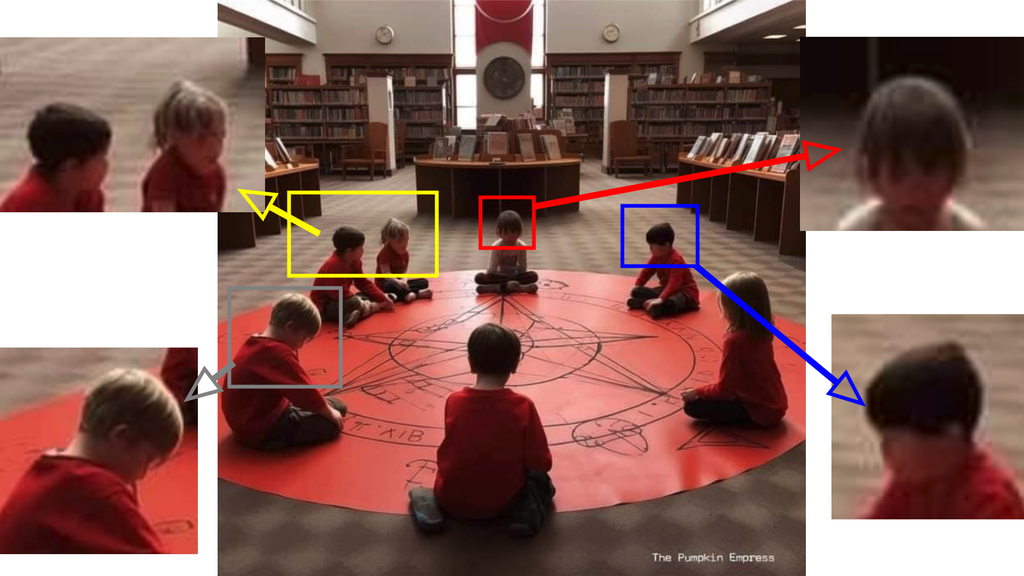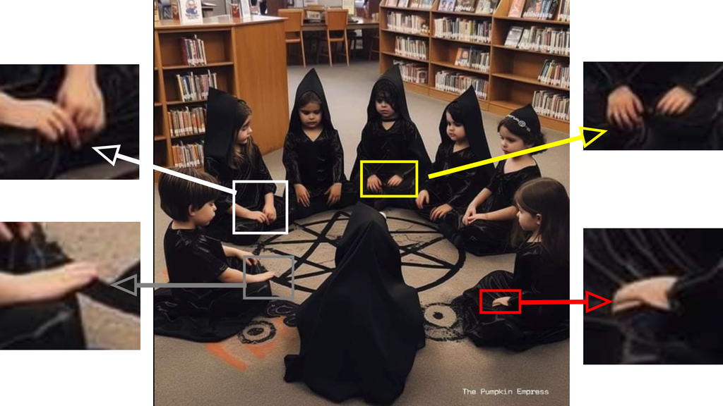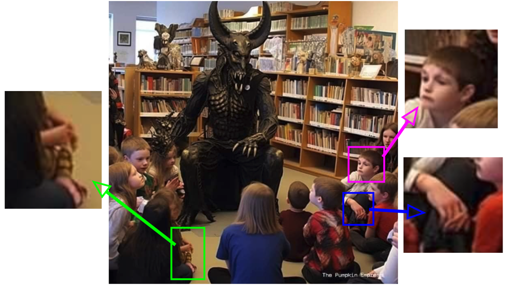 En la primera de las imágenes vemos a un supuesto demonio que parece estar leyendo un libro a un grupo de niños. Como se observa en los recuadros rojo y amarillo, las manos, piernas y pies de estos están superpuestos o entrelazados de forma antinatural. Al pasar la imagen por Optic AI or Not, dio un 75% de posibilidades de que la imagen sea creada con IA.