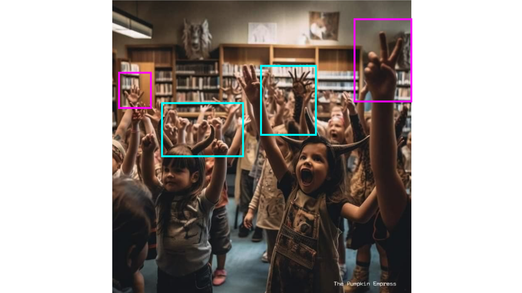 Entre las que más claramente se puede ver que no es real es la del grupo de niños con brazos levantados. Manos con 6 y 4 dedos (recuadros violetas) y un cúmulo de brazos que no sabemos a quiénes pertenecen (recuadros azul claro). Al pasarla por Optic IA or Not, calcula que existe un 81% de posibilidad de que haya sido creada por inteligencia artificial.